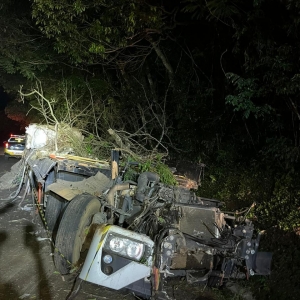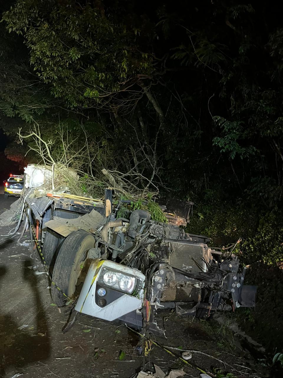 Uma carreta tombou no início da noite deste sábado (26), na PR 471 em Três Barras do Paraná.