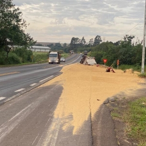 O veículo, que seguia para Santa Catarina, transportava farelo de soja. A carga ficou espalhada pelo local.