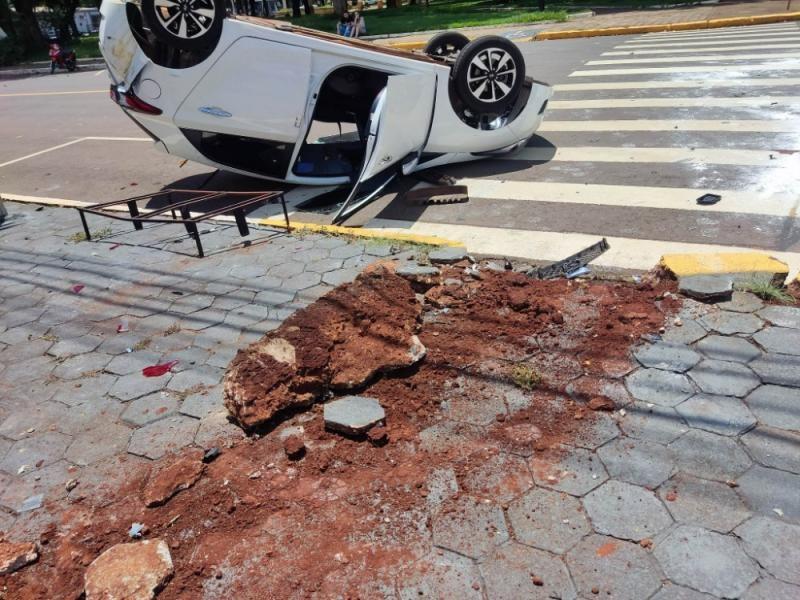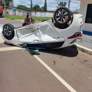 Carro capota após acidente no Centro de Marechal