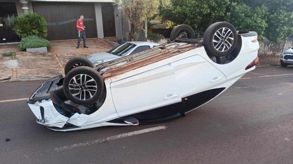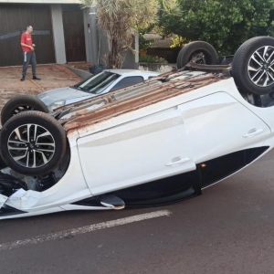 Renault Clio com placas Mercosul e um Hyundai HB20 com placas também no Mercosul conduzido por uma mulher capotou na manhã de hoje (23), na avenida Senador Atílio Fontana área central de Toledo.