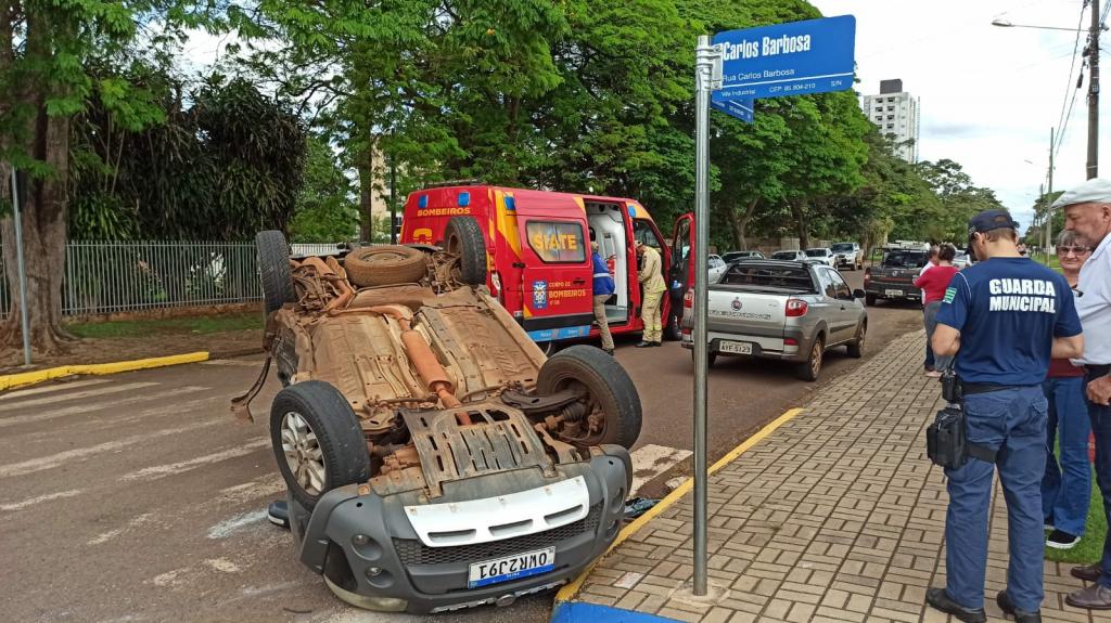 Um Fiat Palio conduzido por uma mulher de 44 anos capotou na quarta-feira a tarde feira no cruzamento da avenida Carlos Barbosa com rua Santo Campagnolo na vila Industrial em Toledo.