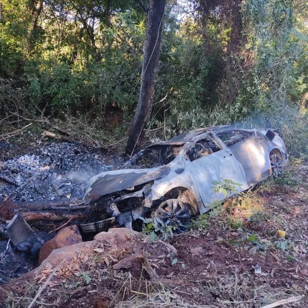 Um carro carregado com cigarros ficou destruído após capotar e pegar fogo, na PR-364, entre Campina da Lagoa e Altamira do Paraná.