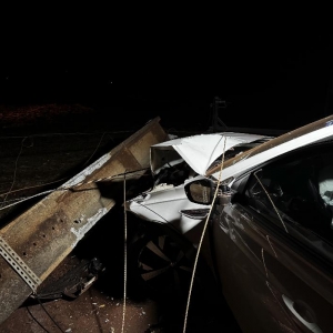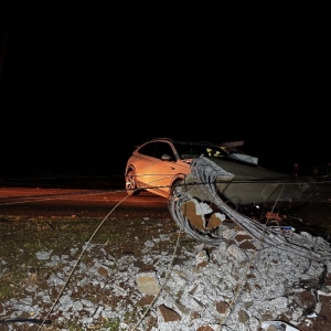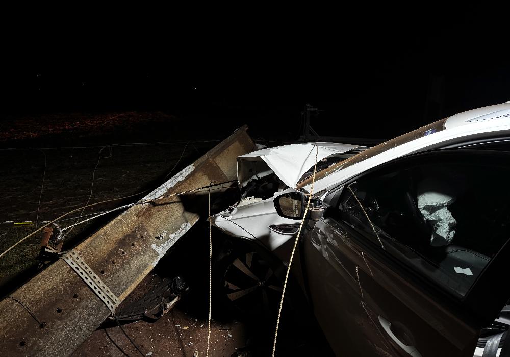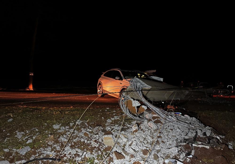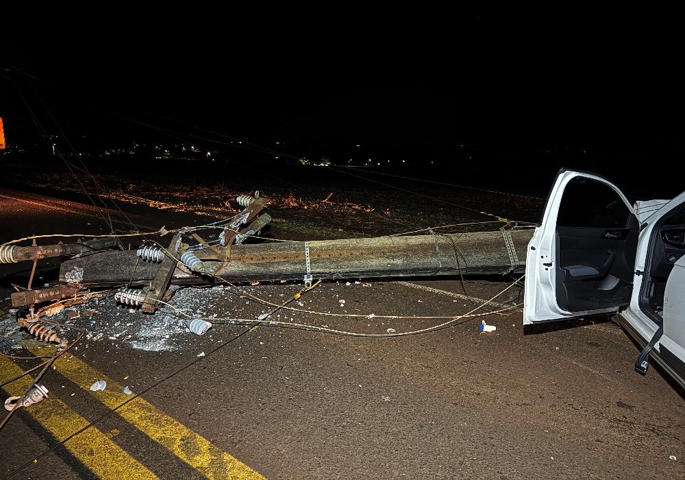 O impacto foi tão forte que ambos caíram ao chão. Um dos postes ficou parcialmente sobre a pista e os fios também se espalharam pela rodovia, deixando a frente do veículo completamente destruída. Os airbags foram acionados no momento da batida. A velocidade permitida desse ponto é de 60km/h.