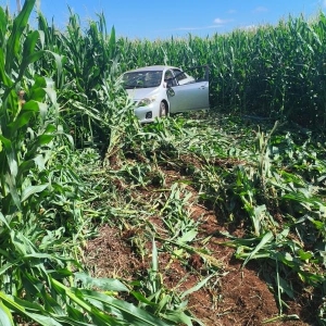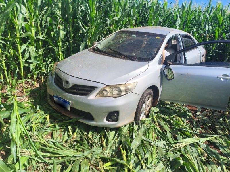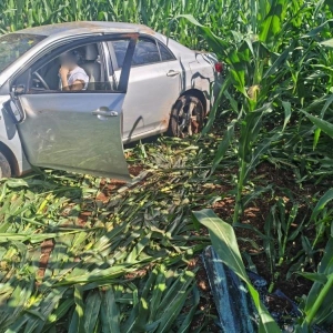 Desgovernado, o veículo saiu da pista e invadiu um milharal, vindo a capotar.