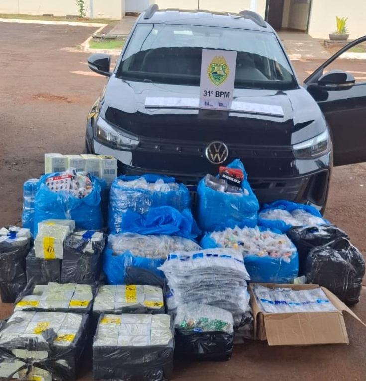 Durante a verificação no interior do automóvel, os policiais localizaram diversas mercadorias de origem estrangeira sem comprovação fiscal, caracterizando o crime de descaminho.
