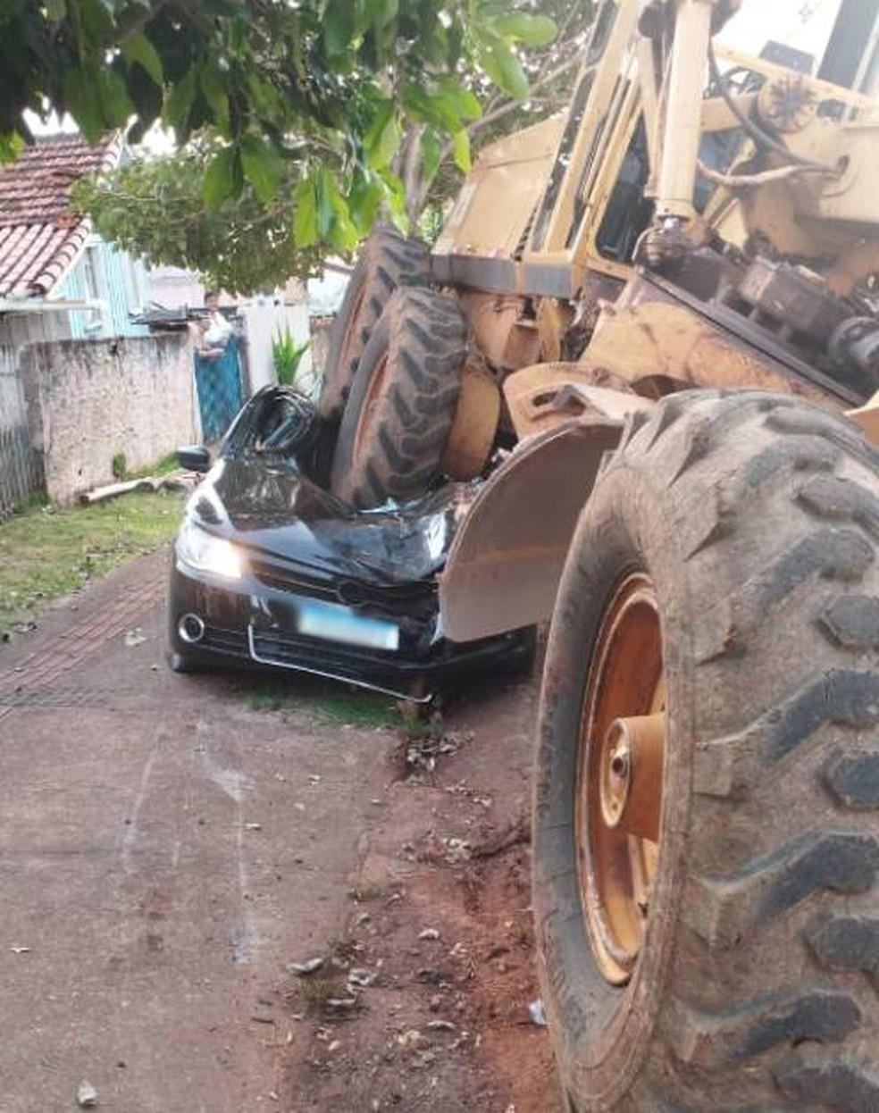 Uma máquina niveladora arrastou e esmagou um carro estacionado em uma rua de Rio Bom, a 30 quilômetros de Apucarana, no norte do Paraná. Ninguém ficou ferido, segundo a Polícia Militar (PM).