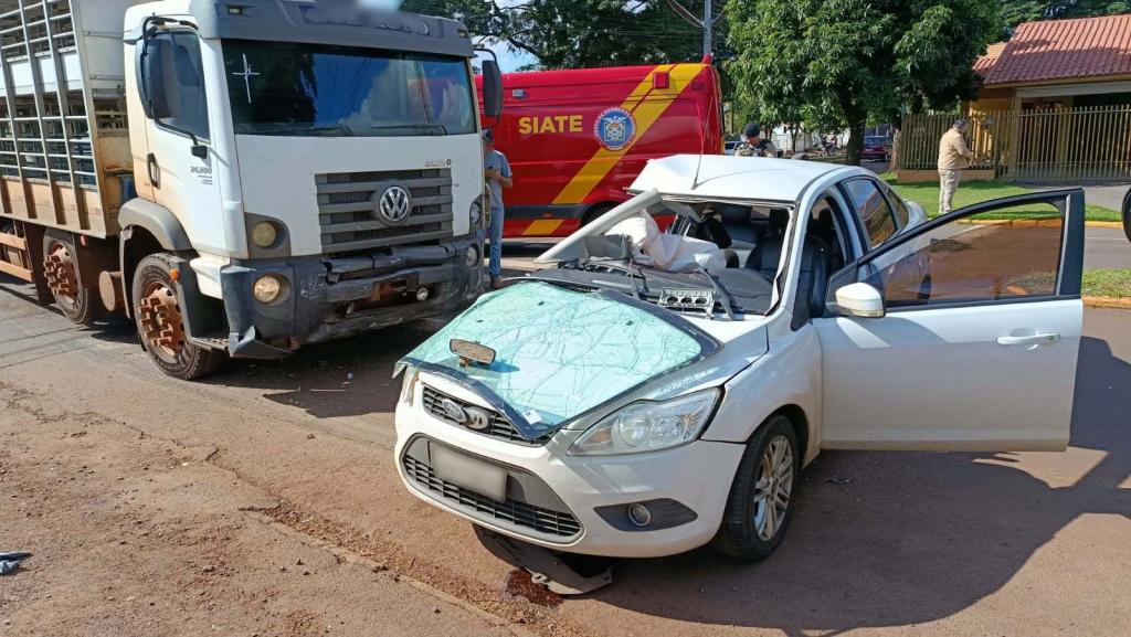 O trânsito de Toledo novamente foi palco de um acidente de grandes proporções. Uma forte colisão ocorreu na tarde desta quinta-feira (3), no bairro Jardim Porto Alegre, envolvendo um caminhão Volkswagen modelo 24.280, de transporte de suínos, e um automóvel Ford Focus com placas de Toledo, conduzido por um homem de 56 anos.