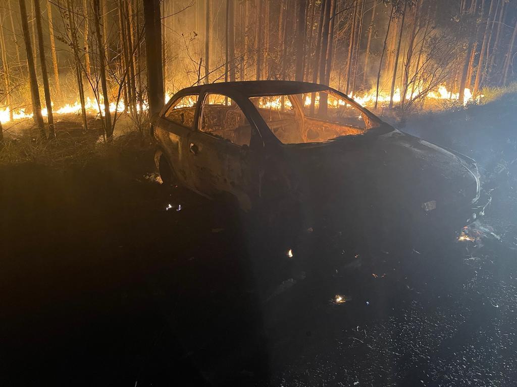 Neste momento, o carro veio a pegar fogo. O incêndio também atingiu uma área de vegetação às margens da rodovia.