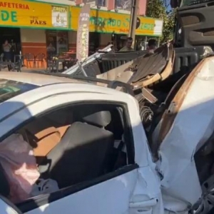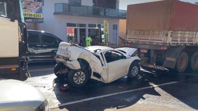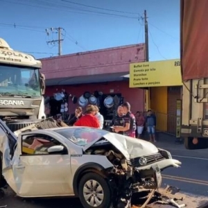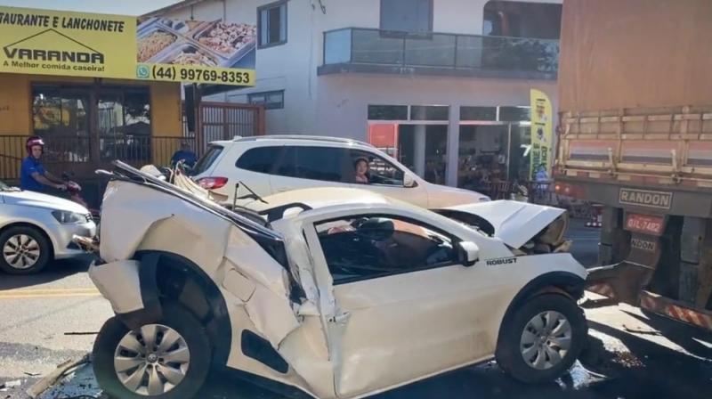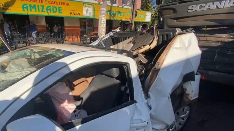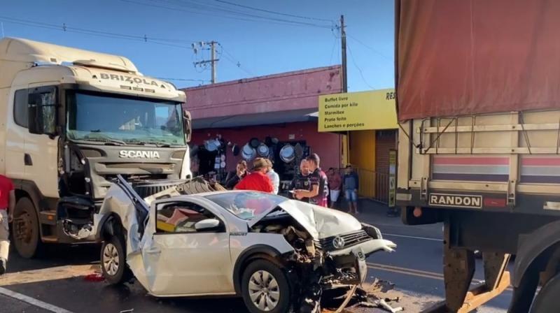 Com o impacto, a Saveiro ficou prensada entre os dois caminhões. O carro ficou completamente destruído.