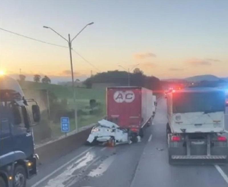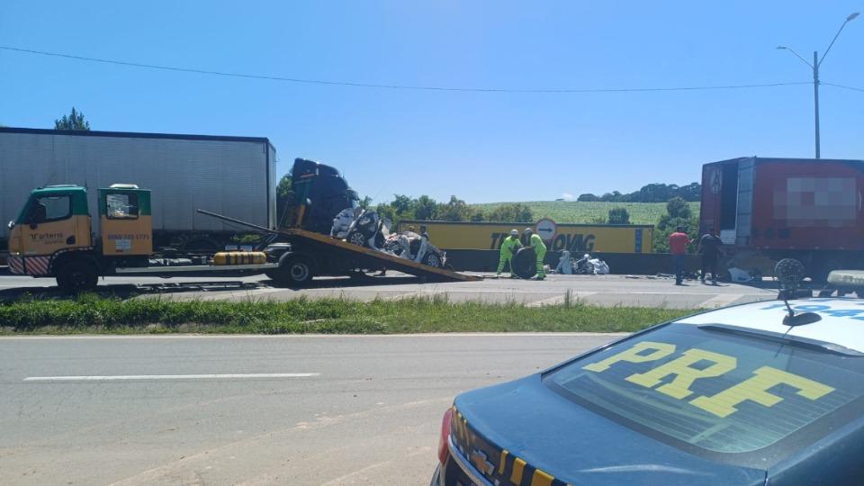 O acidente envolveu dois caminhões e um carro com placas de Assaí, município do Norte do Paraná. Segundo informações da PRF, os três veículos seguiam pela faixa da esquerda da rodovia, que apresentava trânsito lento e, em alguns momentos, até completamente parado. Quando o primeiro caminhão reduziu a velocidade, o carro também diminuiu, mas o segundo caminhão não conseguiu frear a tempo e acabou colidindo violentamente na traseira do veículo de passeio, que foi prensado contra o caminhão da frente.