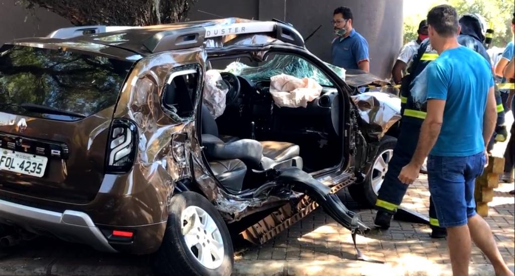 O caminhão bateu em cheio na lateral do carro. Com a força do impacto, o Renault Duster atingiu uma árvore.