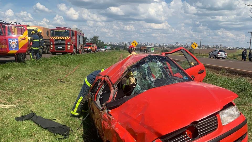 O automóvel, que tem placas de Caçador/SC, foi parar no canteiro central entre as duas pistas da rodovia, o Gol vermelho ficou bastante amassado e com o para-brisa todo quebrado.