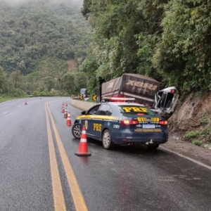 Um veículo ficou prensado entre um caminhão e um barranco na BR 277, mais precisamente na Serra da Esperança, em Guarapuava, no Paraná. O caso foi registrado nesta manhã de terça-feira (30).