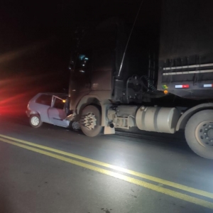A colisão frontal e ocorreu após o condutor do automóvel perder o controle do veículo, invadir a pista contrária e atingir de frente o caminhão.