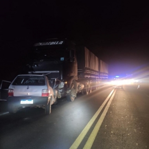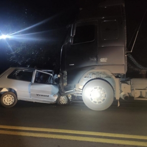 O bitrem tem placas de Guaíra e seguia sentido Laranjeiras do Sul/Virmond e o Fiat Uno seguia sentido contrário.