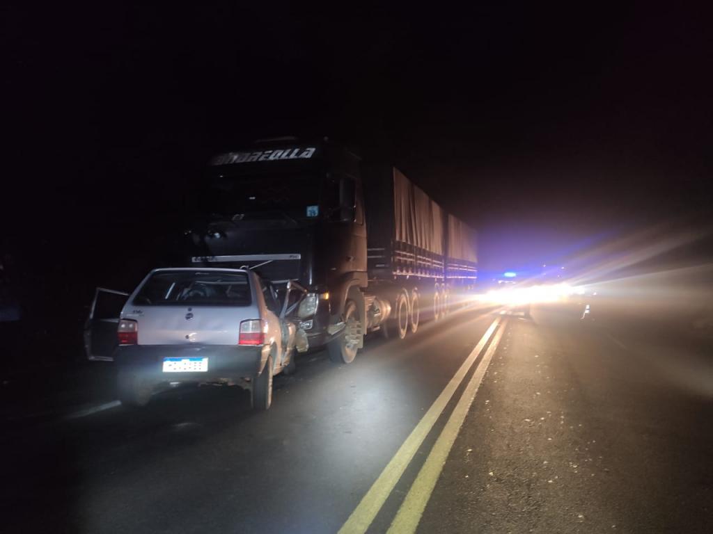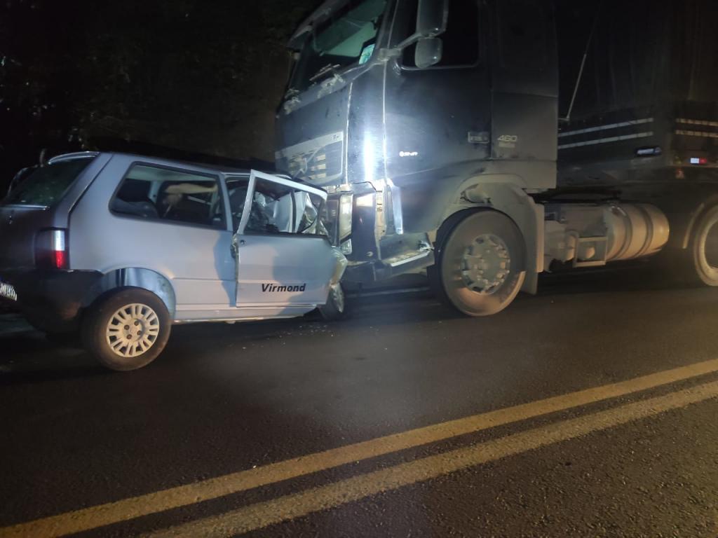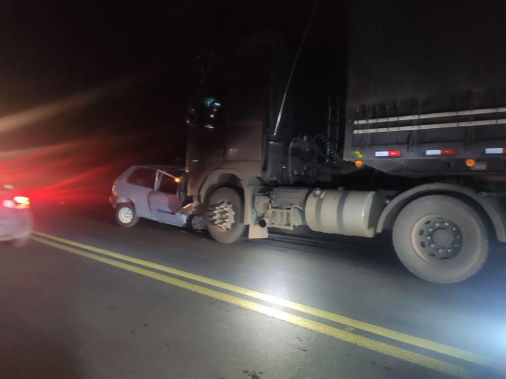 O Acidente aconteceu por volta das 17h40 e envolveu uma Combinação de Veículos de Carga (uma CVC tipo BITREM) e um automóvel Fiat/Uno com placas de Virmond.