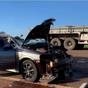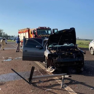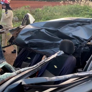 Um carro ficou destruído em um acidente no quilômetro 104 da BR 467 em Cascavel, no Oeste do Paraná, na manhã desta quarta-feira (27).