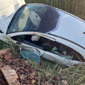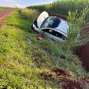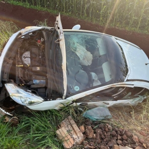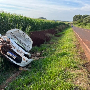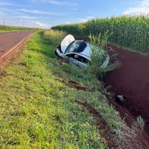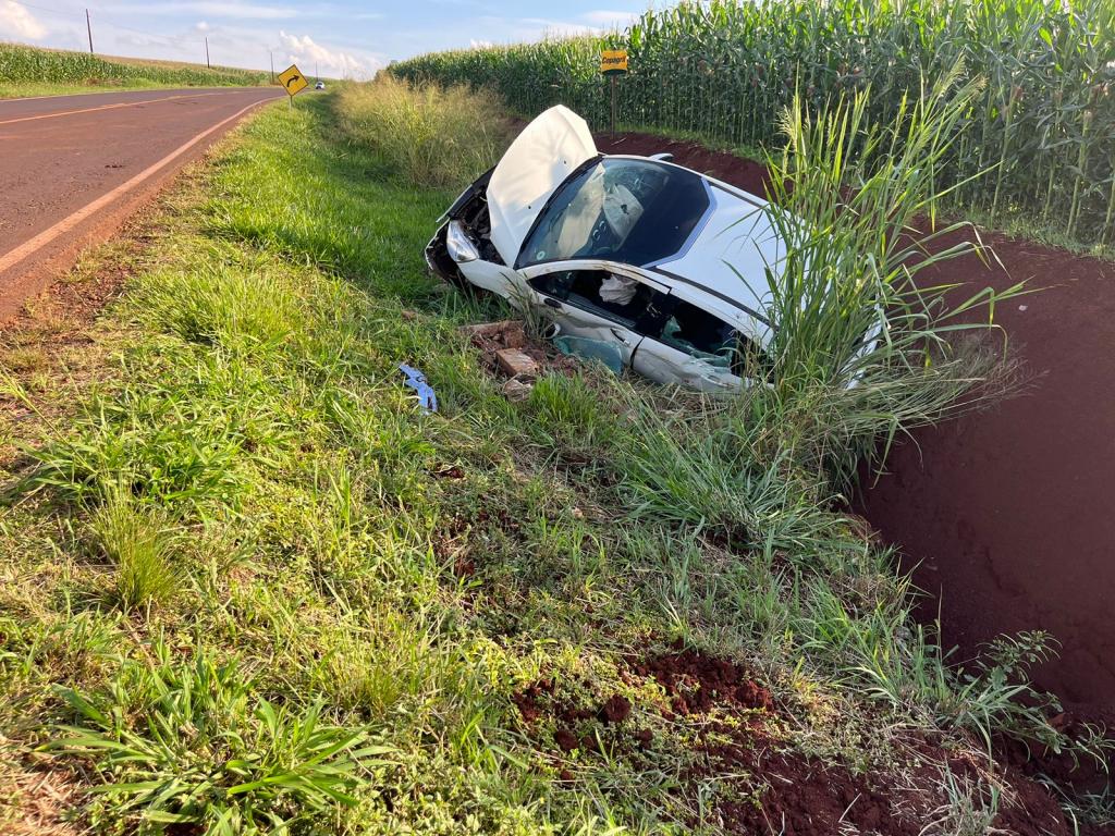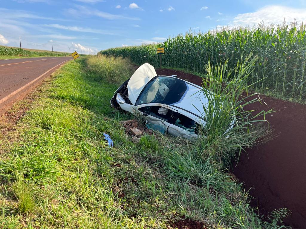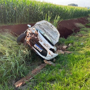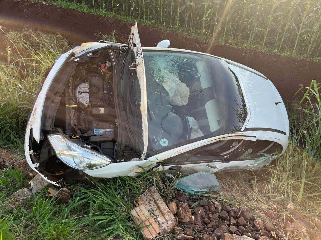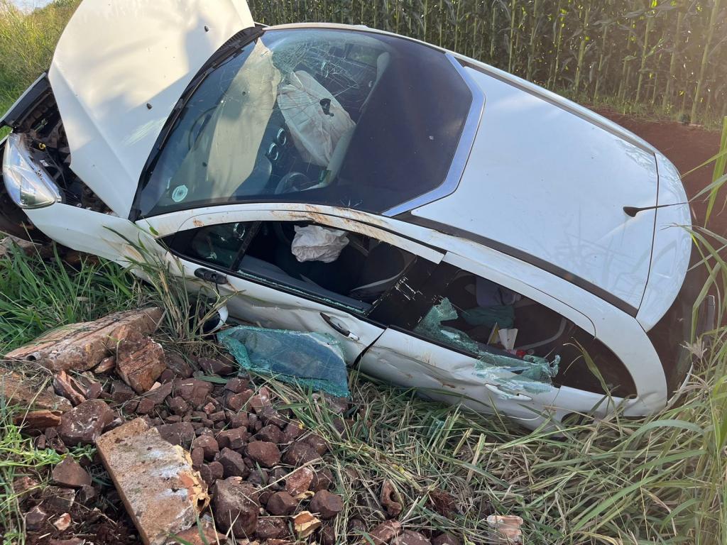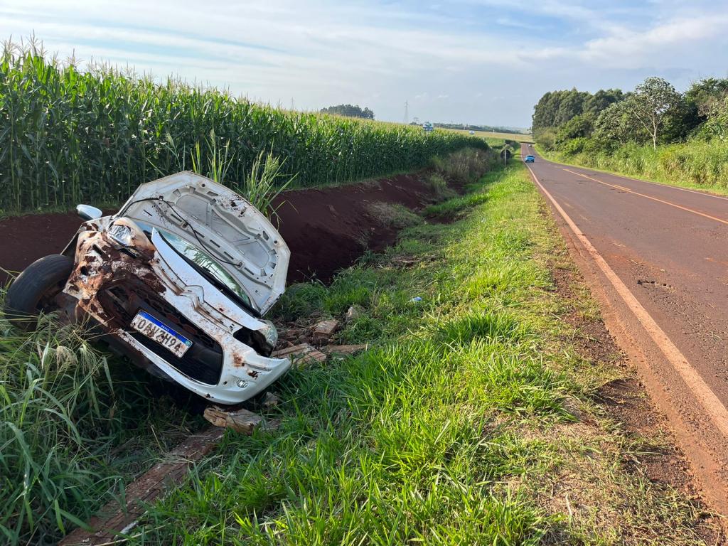 Um Citroen com placas Mercosul capotou após sair da pista na rodovia PR-491 entre Nova Santa Rosa e Marechal Rondon, após Novo Três Passos, próximo a Posto da PRE, na tarde desta sexta-feira.