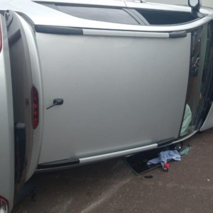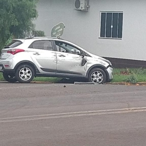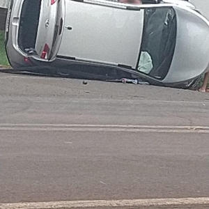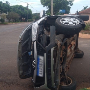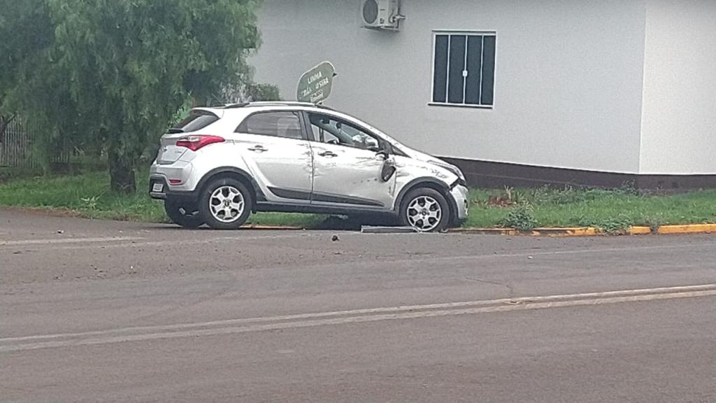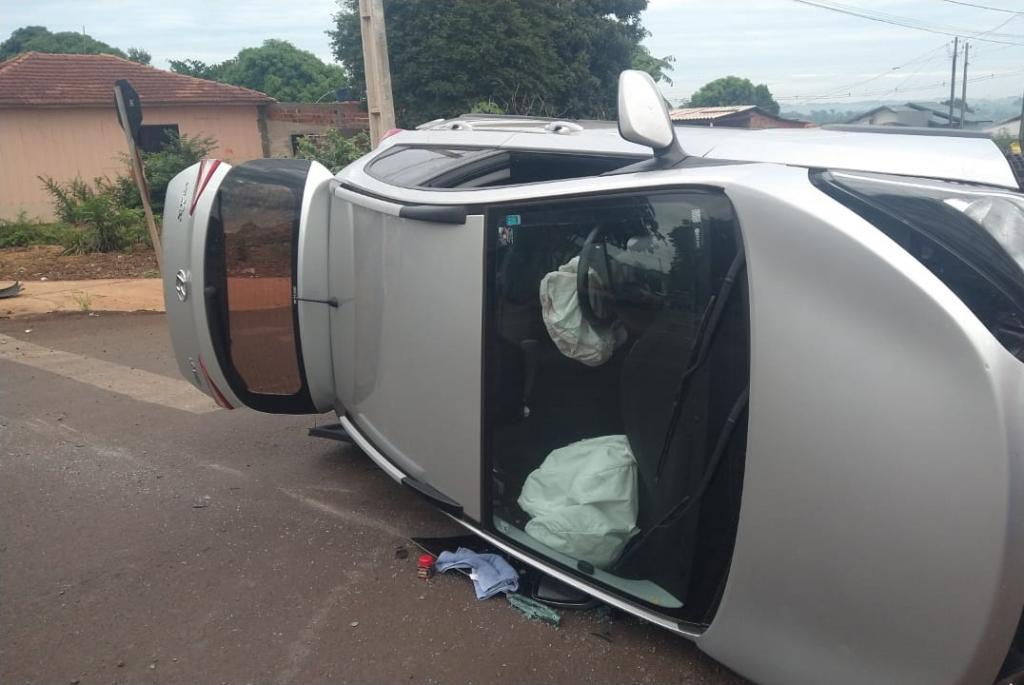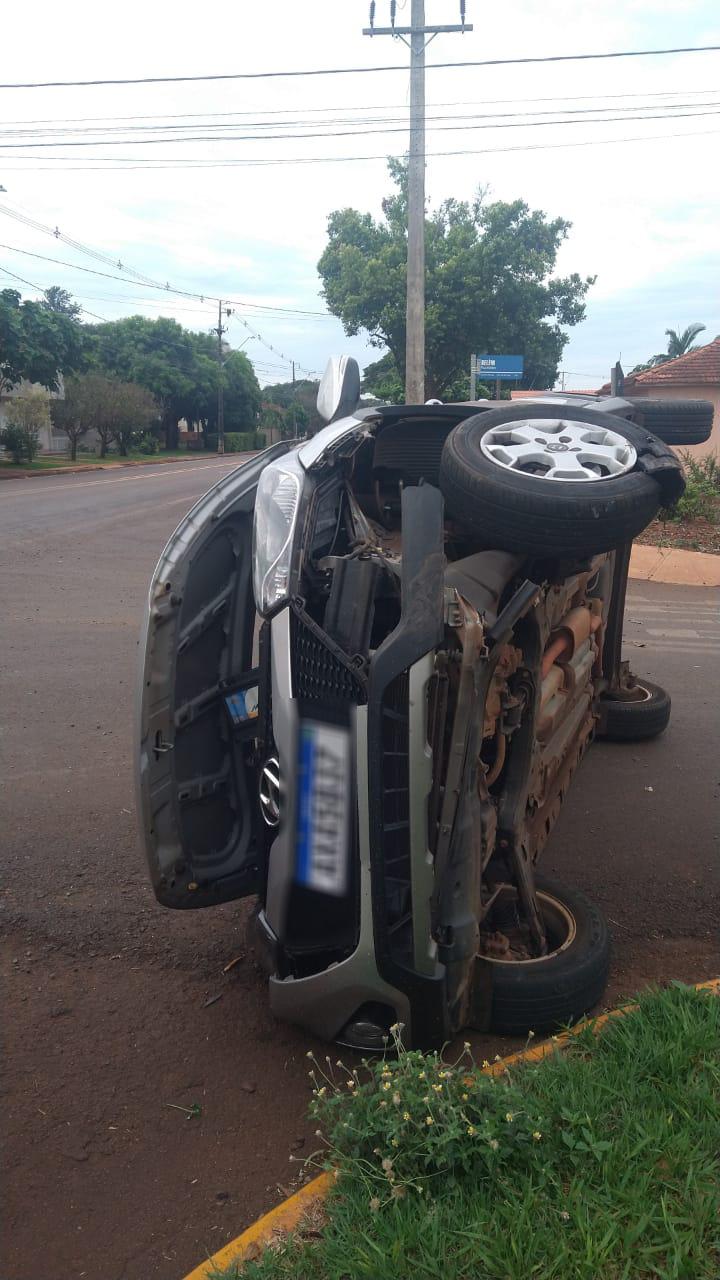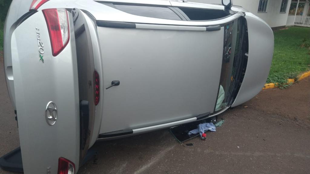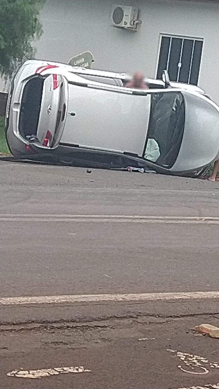 Na manhã desta quinta-feira (3), uma mulher ficou ferida após o veículo que conduzia, um Hyundai HB20, tombar e ficar de lado no centro do distrito de Novo Sarandi, em Toledo.