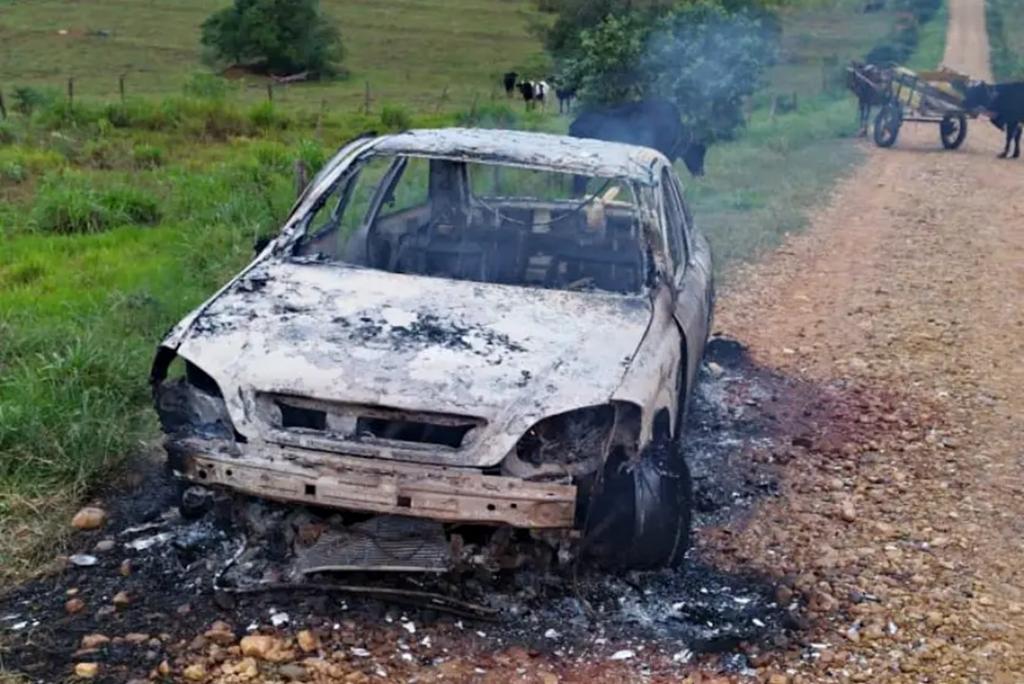 O carro, de cor cinza, foi localizado em uma estrada rural do Distrito de Rio Bonito, totalmente destruído.