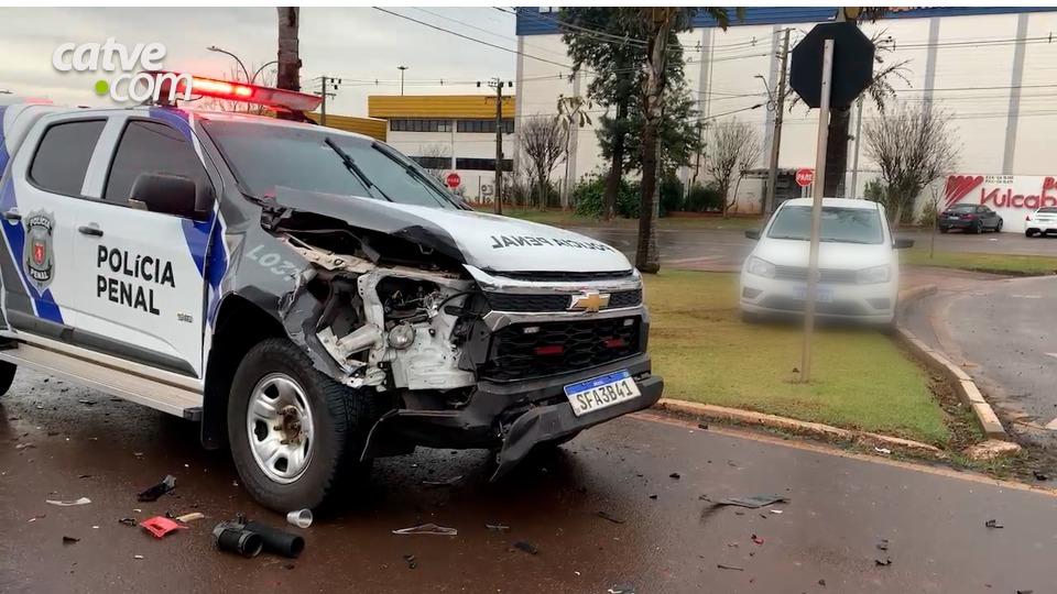 Um acidente de trânsito deixou um motorista ferido nesta quinta-feira (24), na Avenida Brasil, em Cascavel. A colisão envolveu um veículo de uma cooperativa e uma viatura da Polícia Penal do Paraná, que realizava a escolta de um detento.