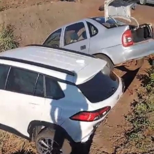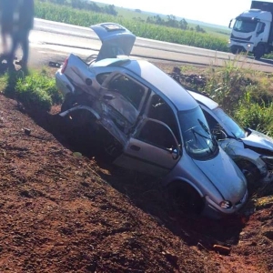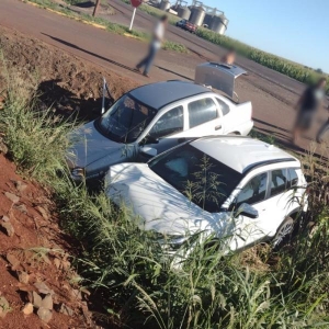 Conforme as informações, dois carros colidiram no trevo de acesso ao distrito de Bela Vista. Com a batida, tanto o Corsa quando o Toyota/Corolla Cross acabaram caindo em uma vala às margens da rodovia.