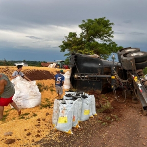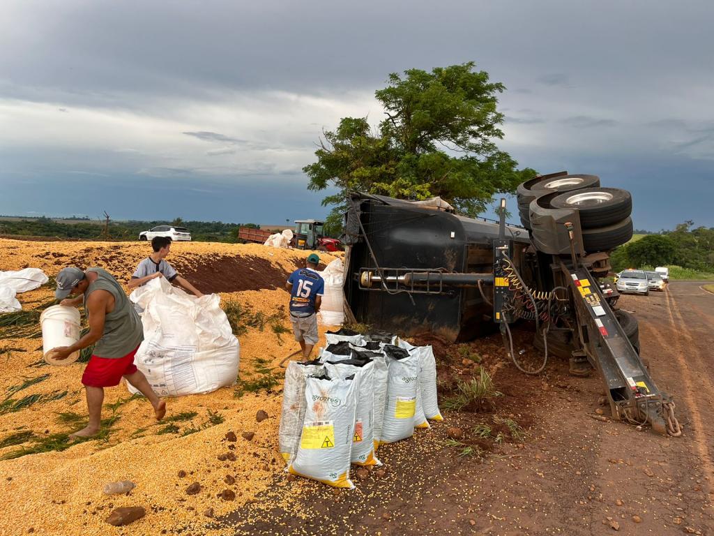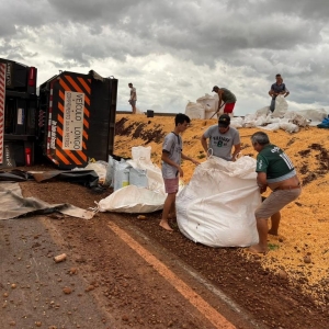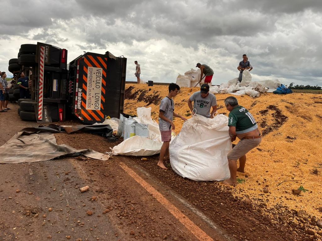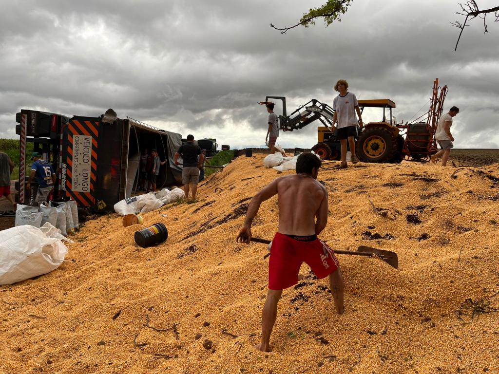 A PM e PRE estiveram no local, um trator auxiliou no recolhimento das bolsas, voluntários ajudaram a recolher a carga que ficou as margens da pista.