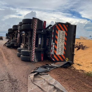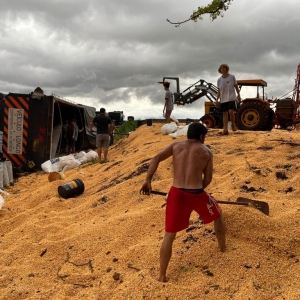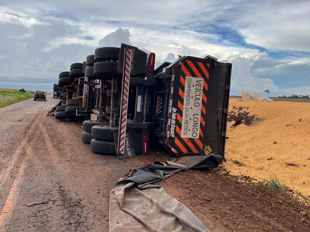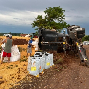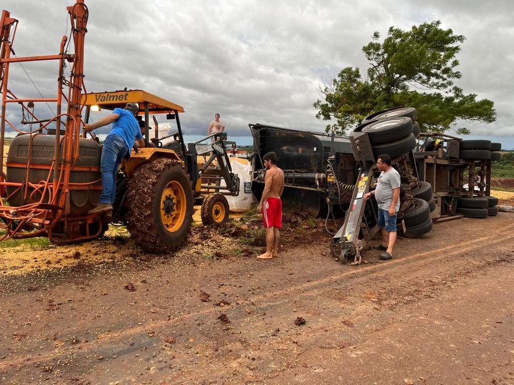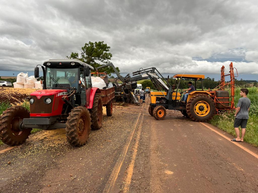 Quatro mil e setecentos quilos de milho foram ao chão após uma carreta com cavalo Volvo, placas Mercosul tombar na rodovia PR-491 em Nova Santa Rosa no final da tarde desta segunda-feira.