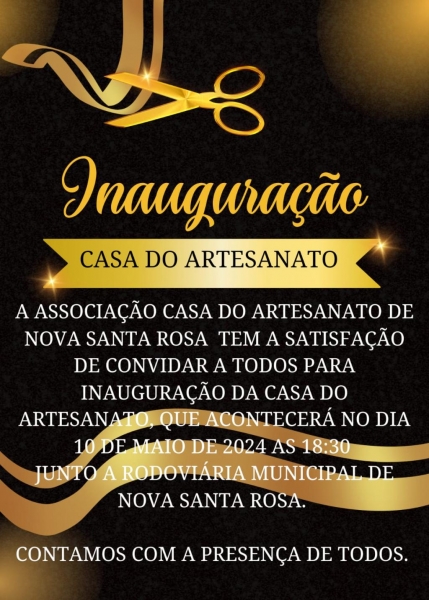 A Associação da Casa do Artesanato de Nova Santa Rosa está convidando a comunidade em geral para a inauguração da Casa do Artesanato que acontecerá na sexta-feira, 10 de maio, as 18h30, localizada nas dependências da Rodoviária Municipal.