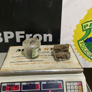 No compartimento de carga da moto foi localizado uma porção de maconha, pesando 160 gramas.