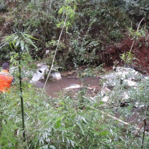 A aeronave foi encontrada dentro do Rio Macaco, que fica entre as duas cidades, na comunidade rural Bela Vista.
