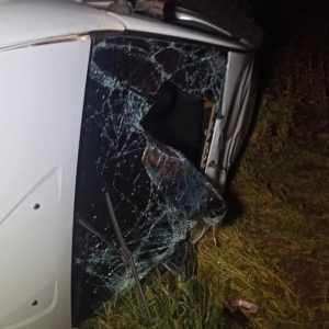 O motorista perdeu o controle do veículo após esbarrar em outro carro, saiu da pista e capotou parando as margens da rodovia na posição de lado.