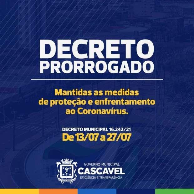 Será prorrogado por mais 15 dias o decreto em vigor em Cascavel com medidas restritivas para o enfrentamento à Covid-19. A vigência da normativa atual termina nesta segunda-feira (12).
