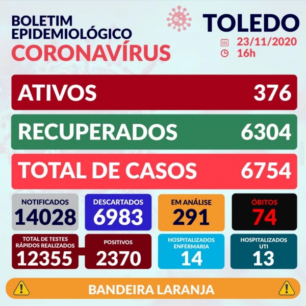 O Centro de Operações Emergenciais (COE) de Toledo divulgou na tarde desta segunda-feira (23) que o município acaba de entrar no Alerta Laranja (risco moderado) para a Covid-19.