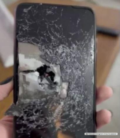 Nas redes sociais, a filha do policial Wendler, Anne Wendler, compartilhou vídeos do aparelho que pode ter salvado a vida dele. Nas imagens, é possível ver a marca do tiro que transpassou a farda do militar e alvejou o celular.