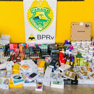Durante patrulhamento na PR-317 no município de Toledo foi abordado um veículo GM/ Corsa com dois ocupantes, onde foi encontrado no bagageiro e sobre os bancos traseiros grande quantidade de celulares de marcas variadas como smartphones, iPhone, Chromebook, Alexas, cigarros eletrônicos, perfumes, produtos de beleza e higiene entre outros totalizando em torno de R$ 100 mil reais em produtos.