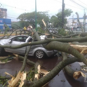 Ventos e chuvas provocaram alguns estragos na cidade, como a queda da árvore em um veículo que estava na Rua Almir Gasparin, na região do Lago Municipal. O carro ficou completamente destruído. Os ocupantes, uma mulher e um bebê, não se feriram.