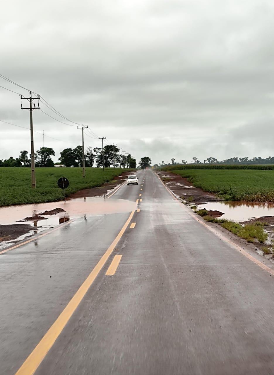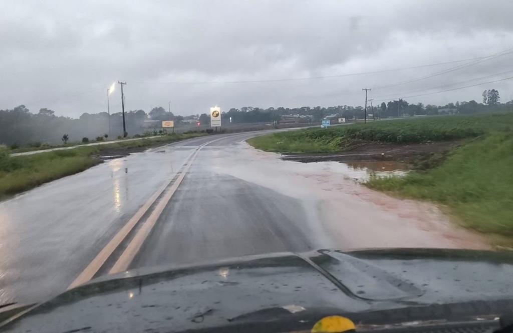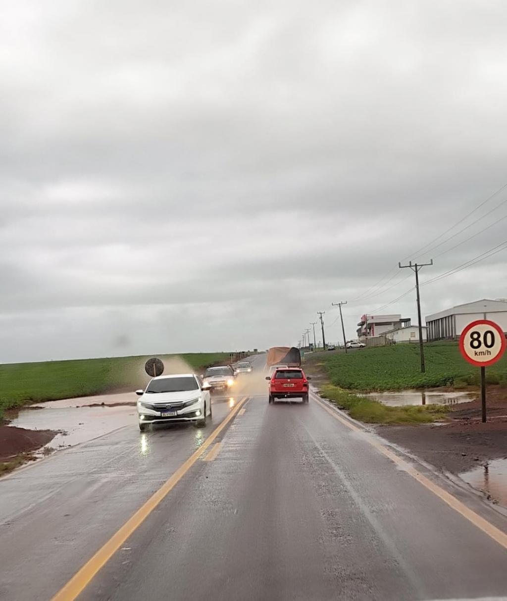 Outro ponto crítico foi registrado antes do Distrito de Novo Blumenau, onde também há acúmulo de água na pista. A situação ainda foi reportada na PR 182, nas proximidades da Cerâmica Drisner, sentido Toledo, onde o internauta observou o acúmulo de água no início da manhã.
