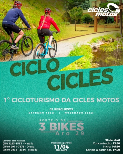 Como parte da programação de inauguração da nova loja da Cicles Motos, no dia 30, sábado, a partir das 14h30, será realizado o Ciclo Cicles - 1º da Cicloturismo.