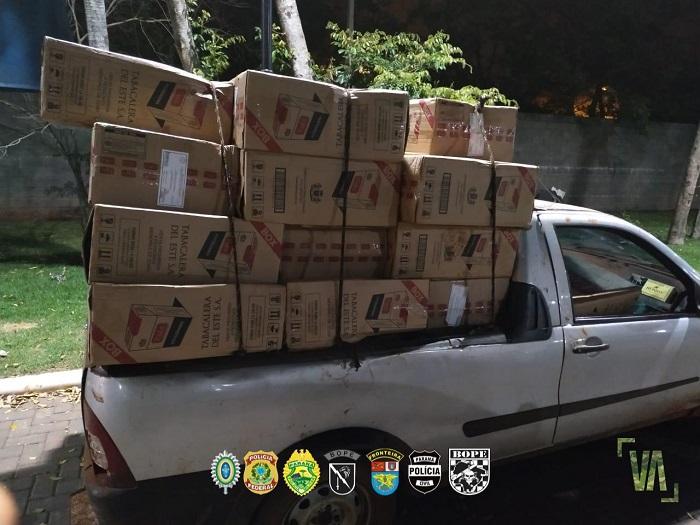 Quando da aproximação policial, o veículo empreendeu fuga em alta velocidade. Após acompanhamento tático, o criminoso abandonou o veículo em meio à lavoura e evadiu pela mata, aproveitando-se da escuridão. A GM Montana estava carregada com cerca de 40 (quarenta) caixas de cigarro paraguaio.