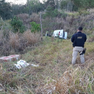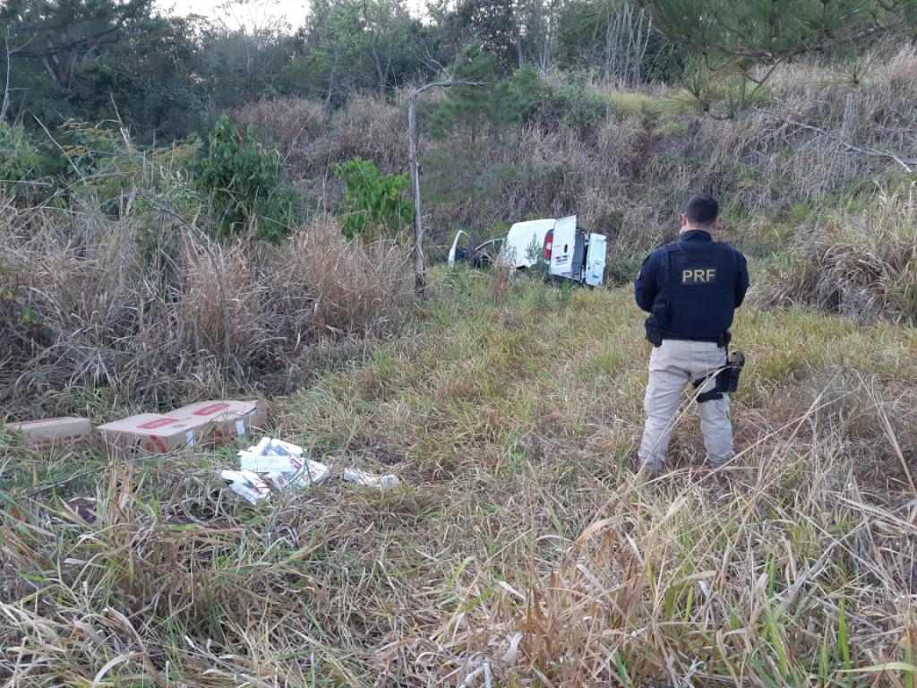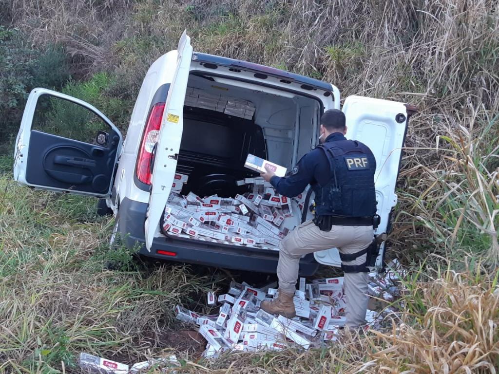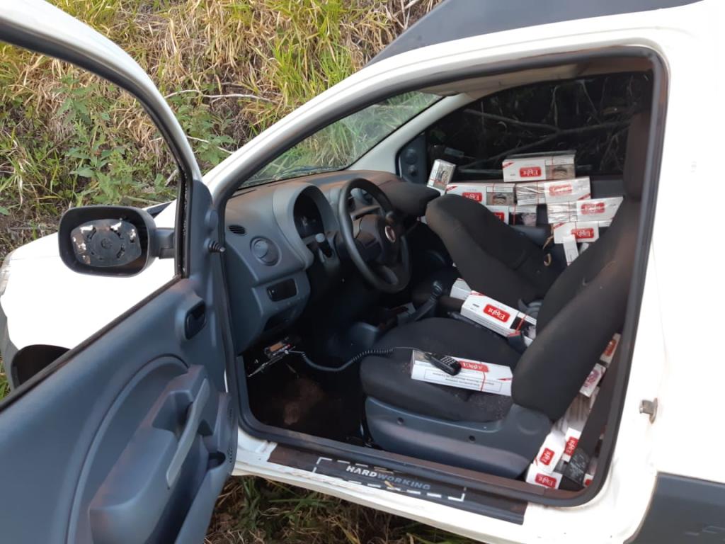 Após buscas no local do acidente, equipe da PRF constatou se tratar realmente de carro carregado de cigarro e que parte da carga fora retirada possivelmente pelos criminosos.