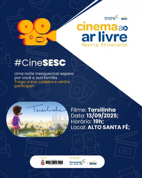 O Sesc, em parceria com a Prefeitura de Nova Santa Rosa, promove uma noite especial de cinema ao ar livre no distrito de Alto Santa Fé. A sessão acontece neste sábado (13), às 19h, no campo ao lado do Clube União.