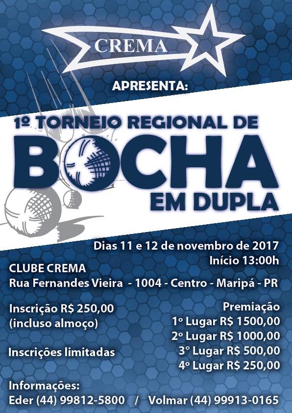 O Clube Crema de Maripá, promove nos dias 11 e 12 de novembro, o 1º Torneio Regional de Bocha em duplas.