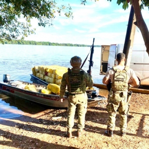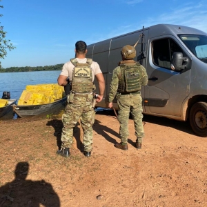 No local da abordagem, foram localizadas duas embarcações de metal, medindo aprox. 6 metros, ambas equipadas com motores Mercury 50 HP, um veículo, Renault/Master, além de aproximadamente 80 caixas de cigarros contrabandeados do Paraguai.