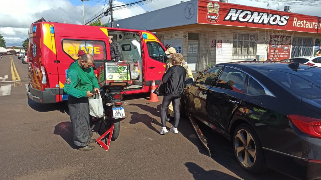 Um acidente foi registrado por volta das 15h40 desta sexta-feira no cruzamento da Rua Santos Dumont com Rua Souza Naves área central de Toledo e envolveu uma moto Honda CG Titan de 160 cilindradas placa Mercosul conduzida por um homem de 44 anos e um veículo Honda Civic com placas também do Mercosul conduzido por uma mulher.