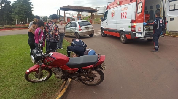 Um veículo Citroen C3 e uma moto Yamaha YBR 125 cilindradas, os dois veículos conduzido por mulheres colidiram na tarde desta quinta-feira na rotatória da avenida Senador Atílio Fontana com rua dos Pioneiros próximo ao loteamento Jardim Bressan em Toledo.