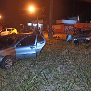 Colisão entre dois carros no Jardim Coopagro, no cruzamento da rua Albino Scariot com rua Pindotiporã, um Ford Escort conduzido por um rapaz de 32 anos e um veículo Fiat Siena, os dois com placas da cidade.