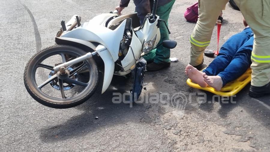 Com o impacto, a condutora da motocicleta acabou sofrendo queda e resultou com ferimentos leves. Ela foi socorrida por uma equipe do Corpo de Bombeiros e encaminhada para atendimento médico. A motorista do carro não se feriu.