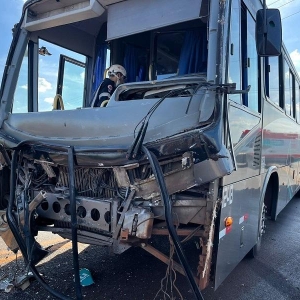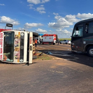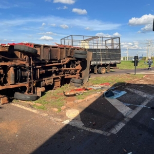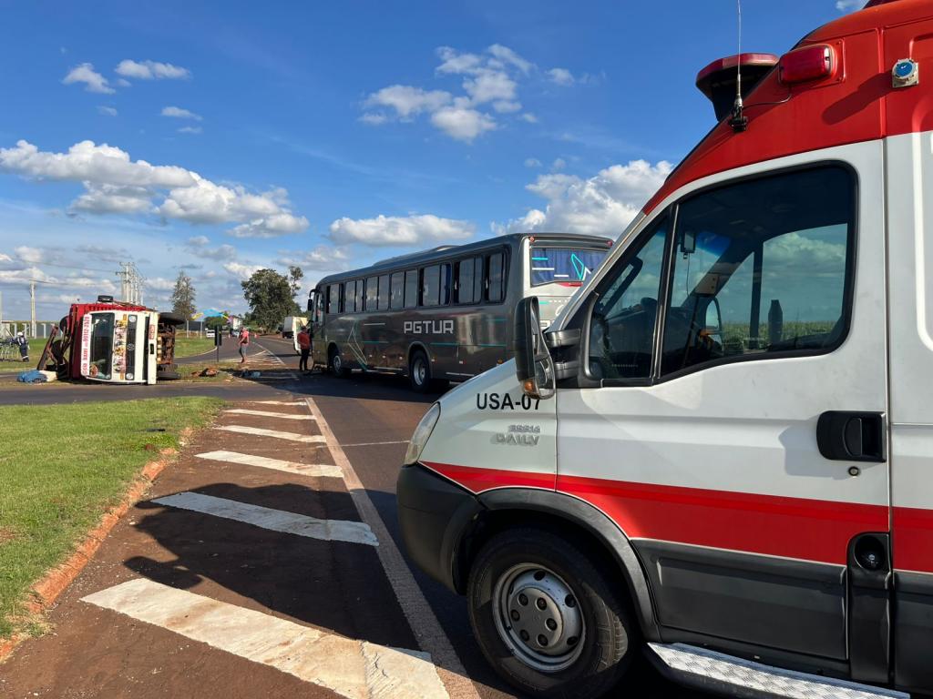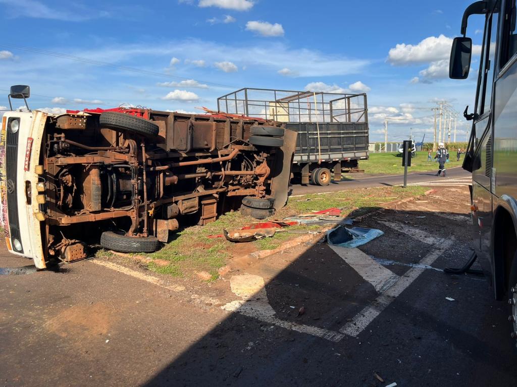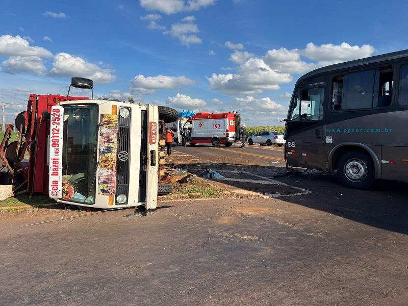Com o impacto, o caminhão tombou e ficou de lado, enquanto o ônibus permaneceu parado na pista. O trânsito precisou ser desviado pelas laterais do trevo, gerando grande movimentação na região.