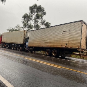 Um caminhão Mercedes-Benz, que seguia no mesmo sentido, não percebeu a carreta parada sobre a pista e colidiu na traseira do veículo. O forte impacto causou grande danos.